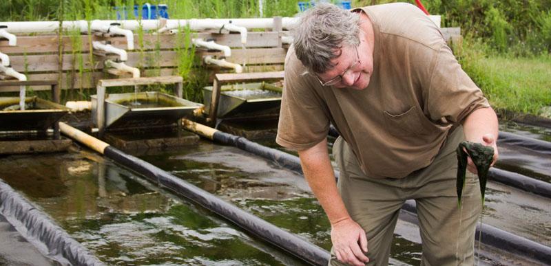 Dr. Patrick Kangas examines algae from an experimental raceway utilizing agricultural drainage water on Maryland's Eastern Shore.