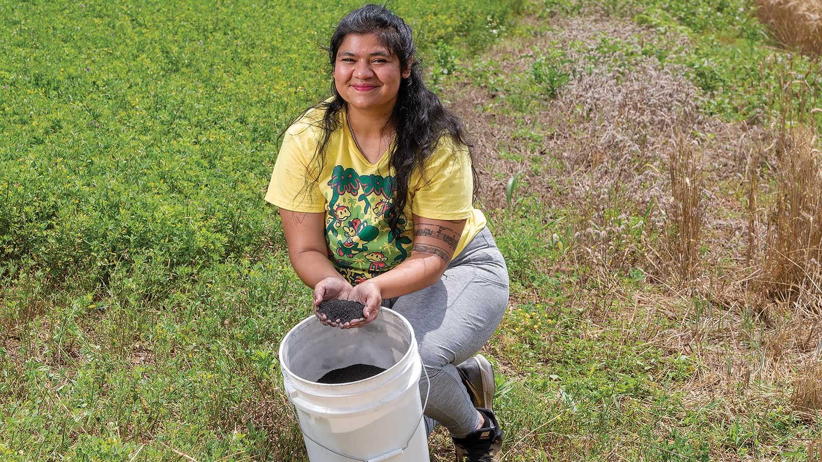Usoshi Chatterjee scoops a handful of poultry-waste-derived biochar.