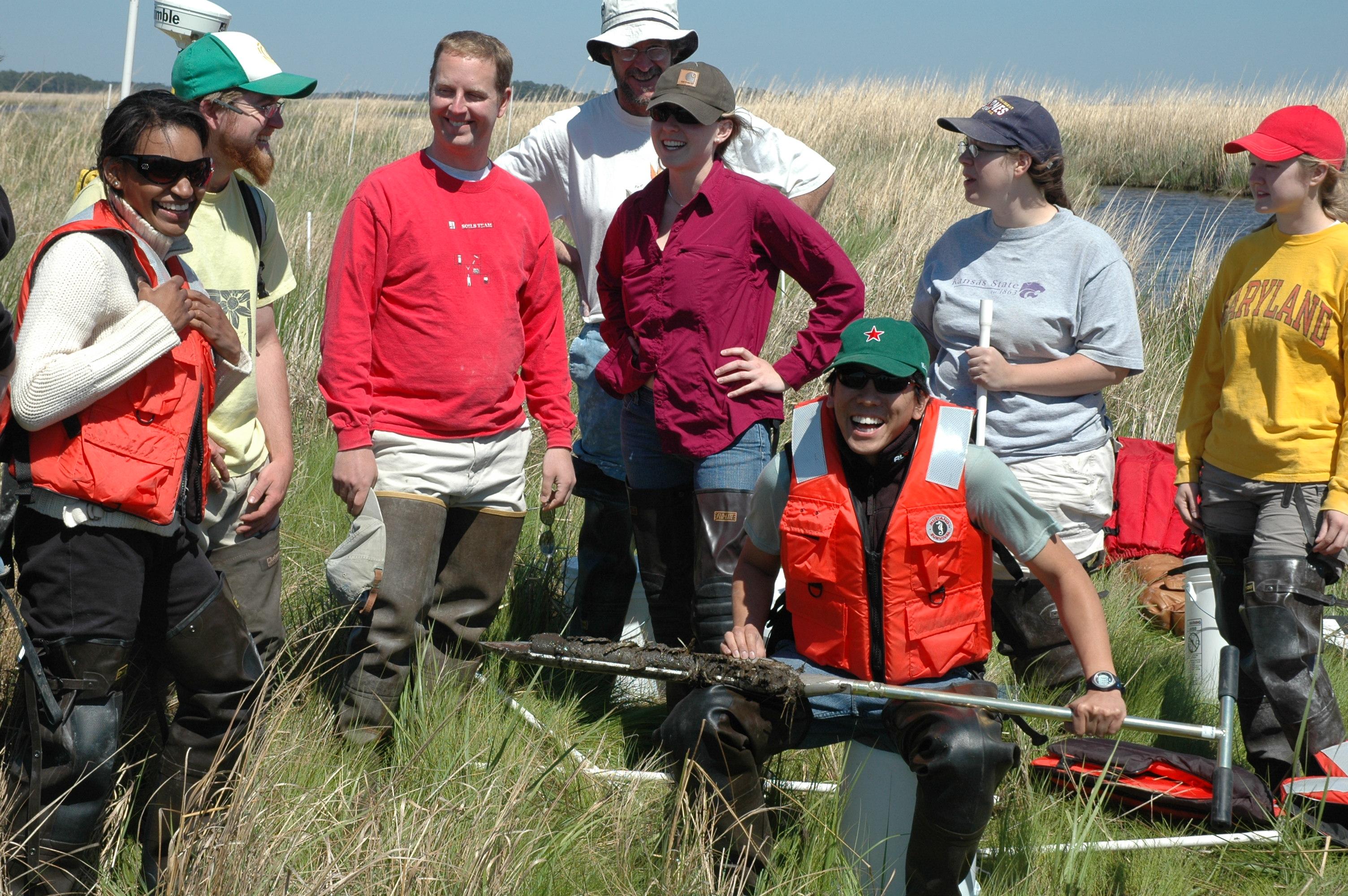 ENST Associate Professor Brian Needelman (third from left) works with a group of students, staff and volunteers sampling soils at a marsh at the Blackwater National Wildlife Refuge in Dorchester County, MD.