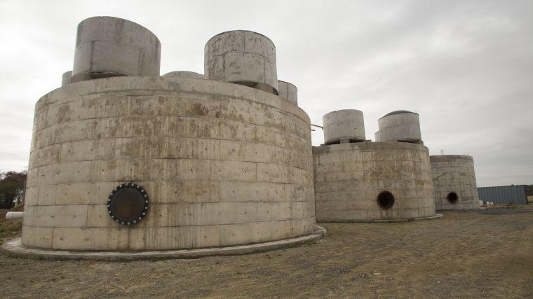 Three anaerobic digesters designed to convert poultry waste into methane gas that is usable as an alternative energy source sit on Jason Lambertson’s farm in Pocomoke City. The digesters are part of a pilot program that will launch this year.