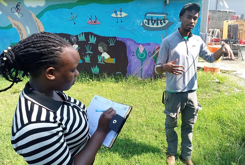 Grace Nalugwa meets with Justan Randolph (BS '18) from Green Mechanics, LLC. at the Bladensburg Waterfront Park to view the green bulkheads project.