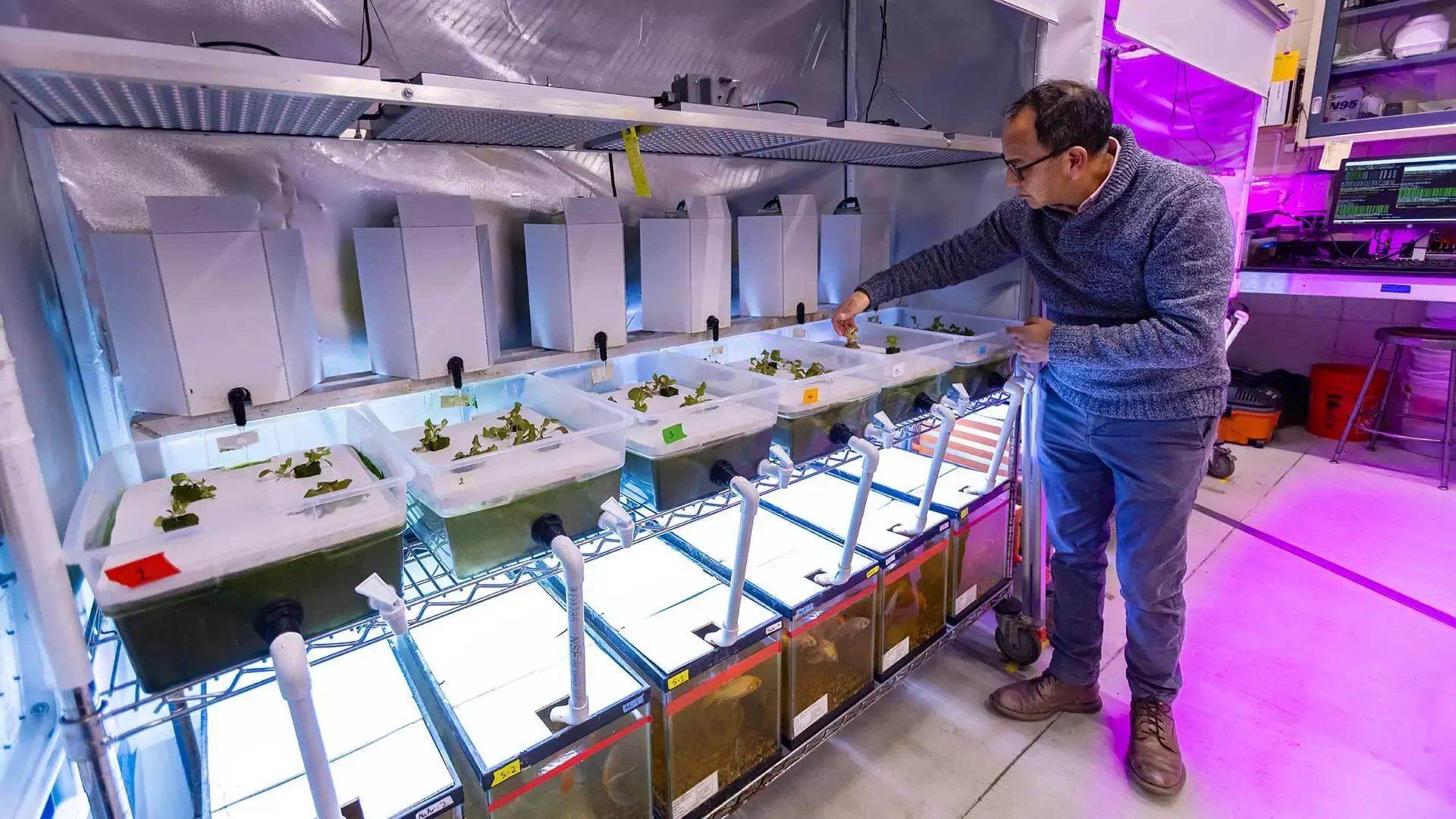 ENST's Dr. Jose-Luis Izursa works in his aquaponics lab in UMD's Animal Science Building. The lab will open a new, larger aquaponics facility later this month in a greenhouse facility near the Xfinity Center.