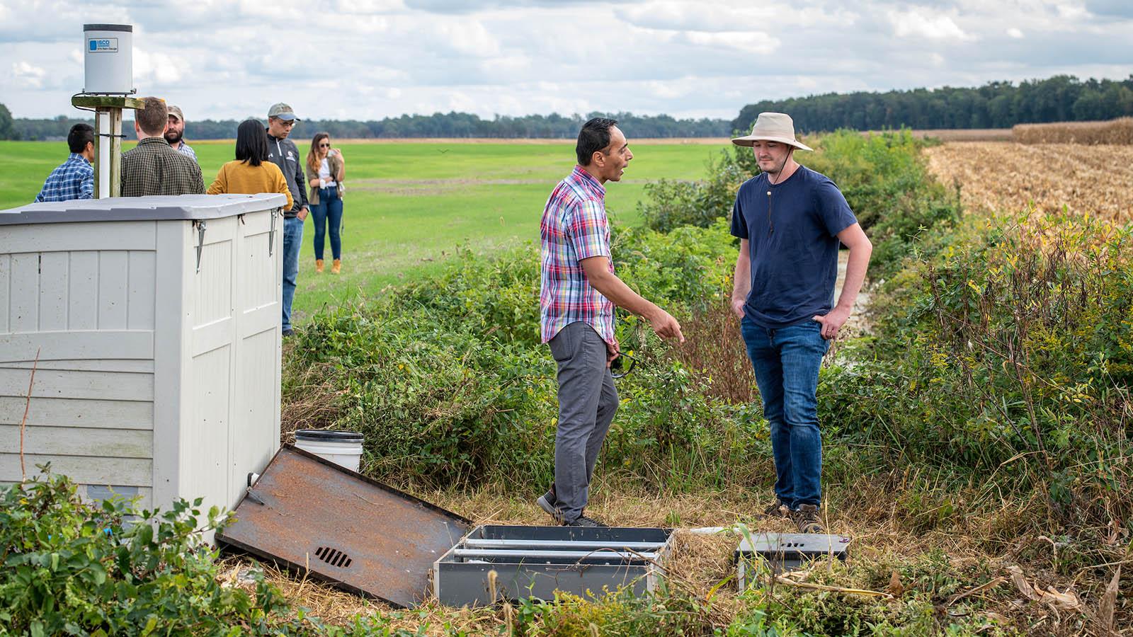 ENST's Dr. Gurpal Toor (center) talks with Dr. Jared Wilmoth (right) at one of his field sites measuring phosphorus runoff from agricultural activities nearby.